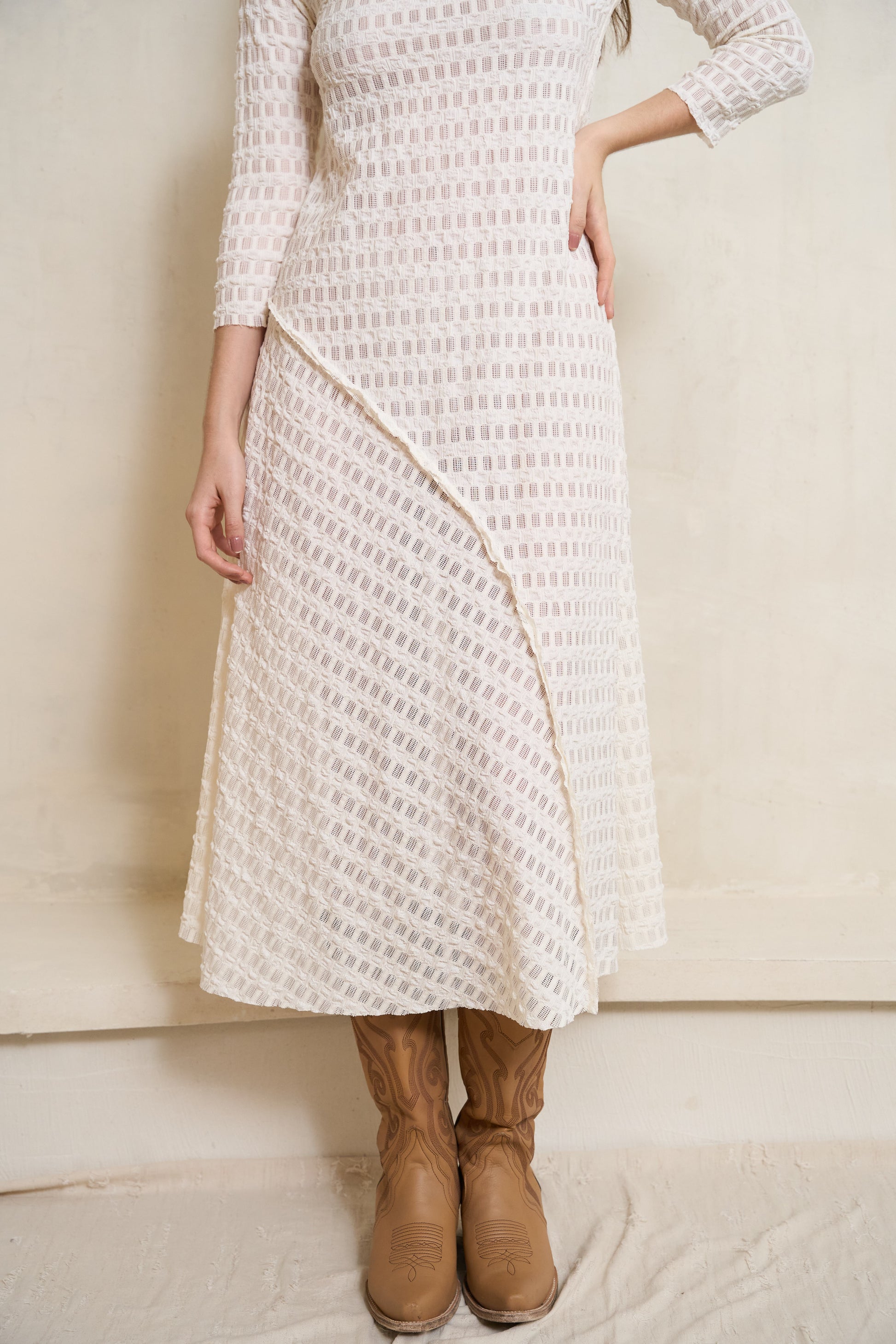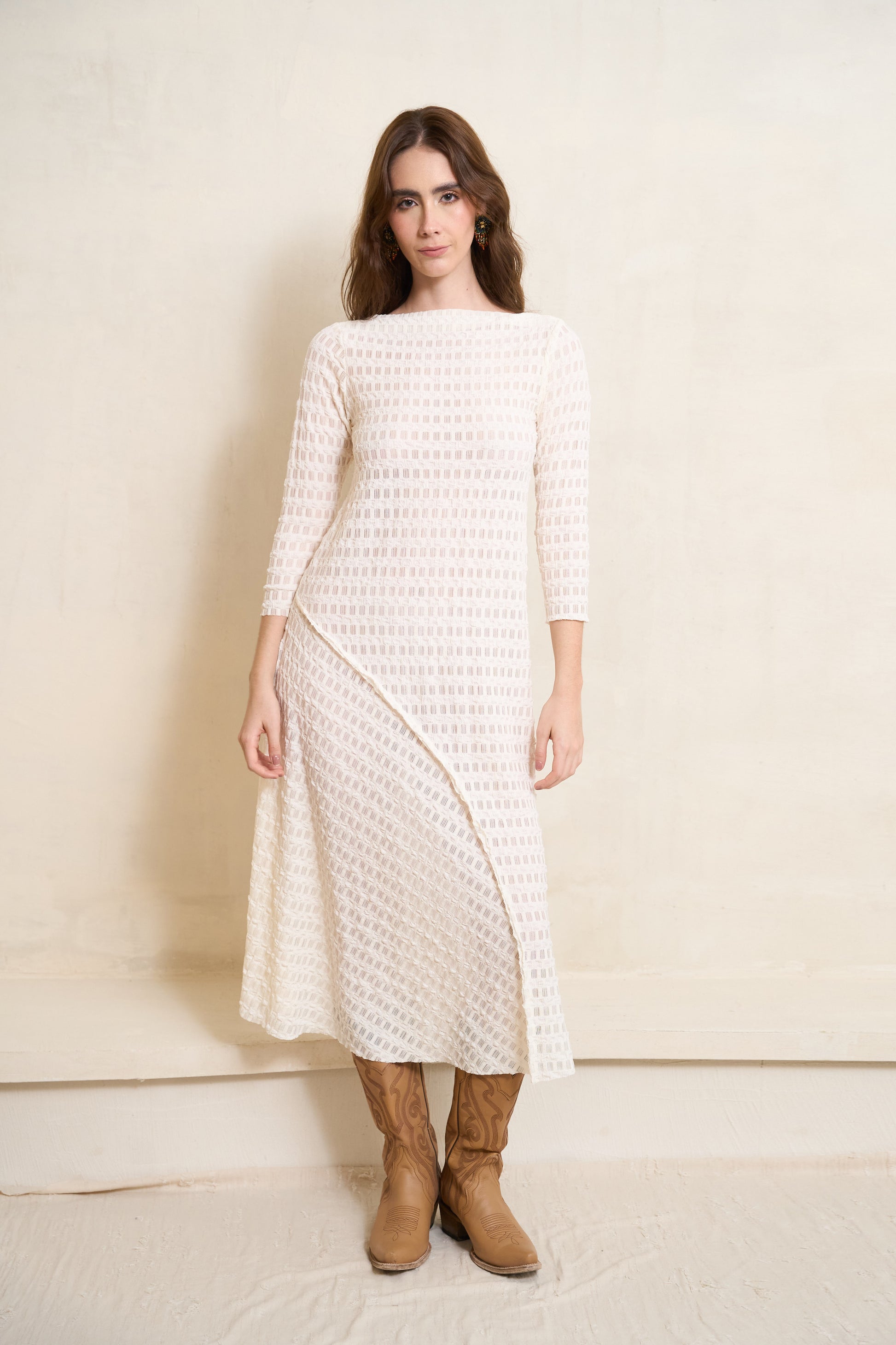 Vestido largo y translúcido en tela elástica con textura. Cuenta con escote bandeja y mangas 3/4. Tiene un corte asimétrico en el delantero que aporta movimiento. Los acabados son al corte, para un look más relajado y descomplicado.
