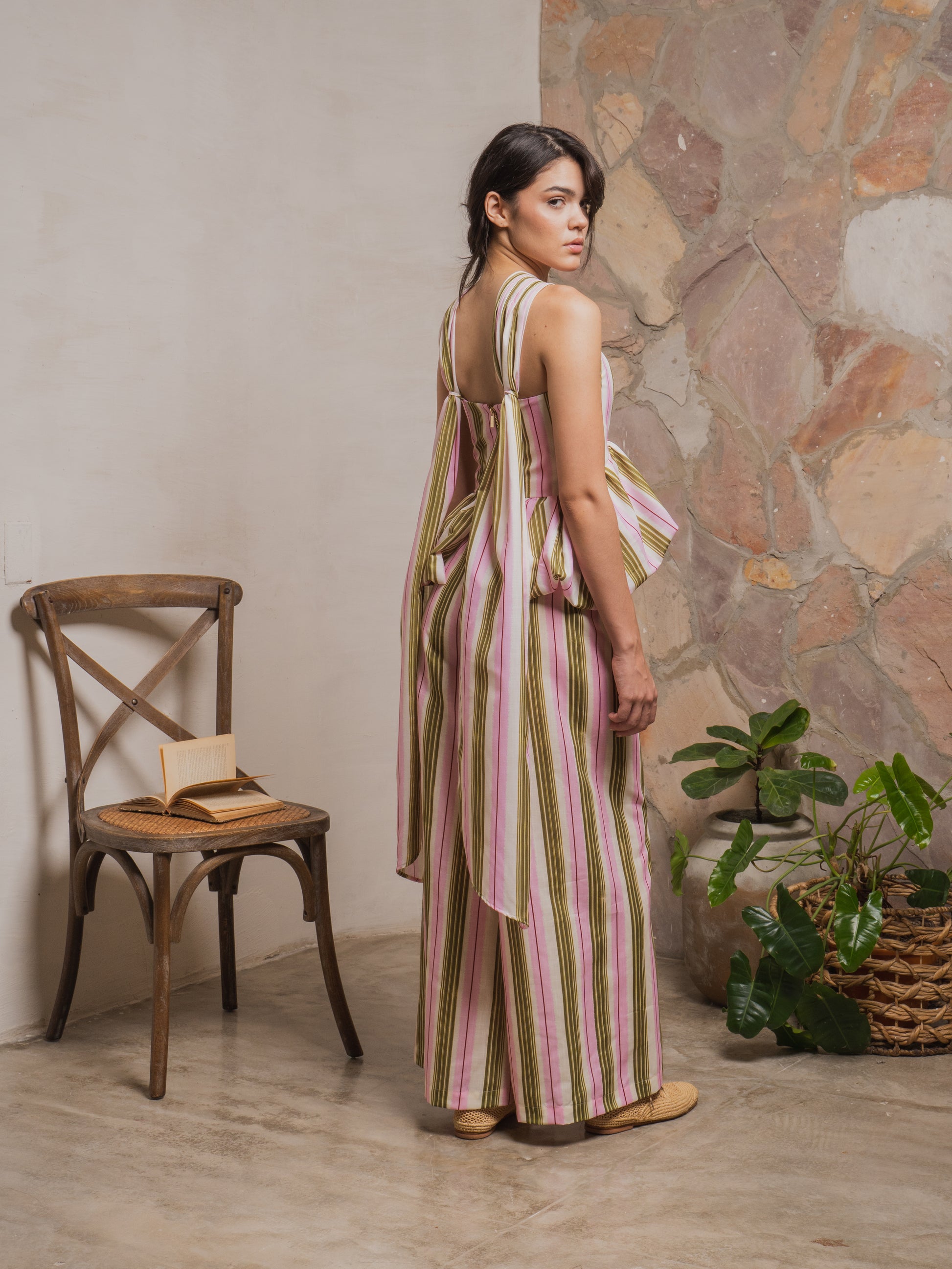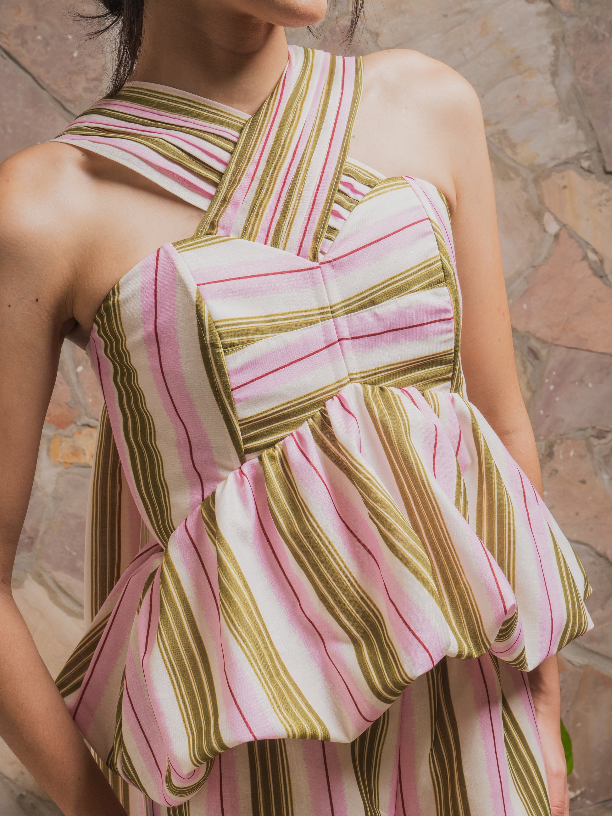 Top estampado de corte imperio con estructura tipo corset en la parte superior y silueta globo en la parte inferior. Tirantes ajustables plisados con alforzas. Cremallera en la parte posterior. Los tirantes se pueden anudar formando una corbata o dejarlos sueltos.