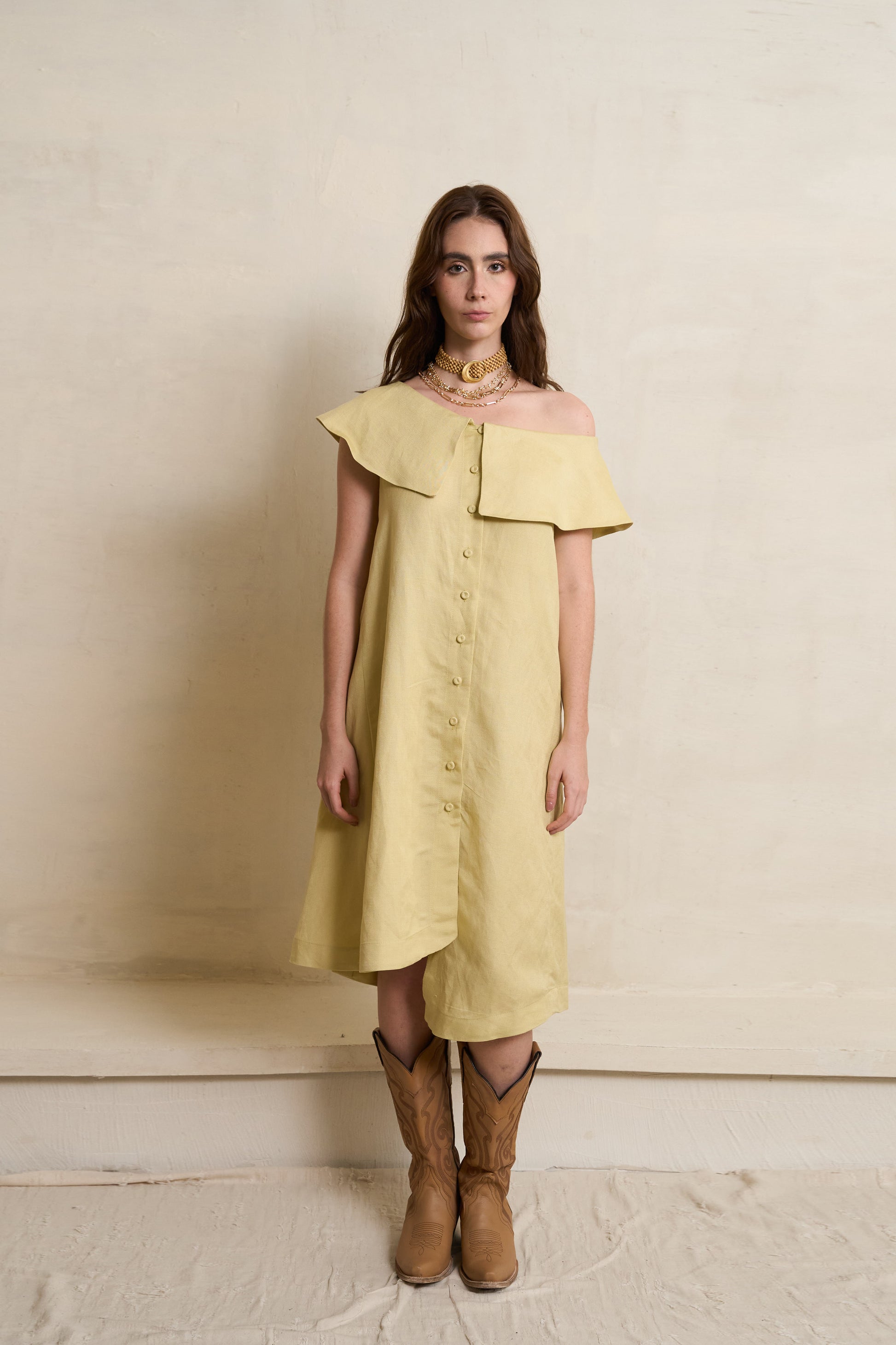 Vestido midi de corte irregular , con cuello grande tipo solapa .