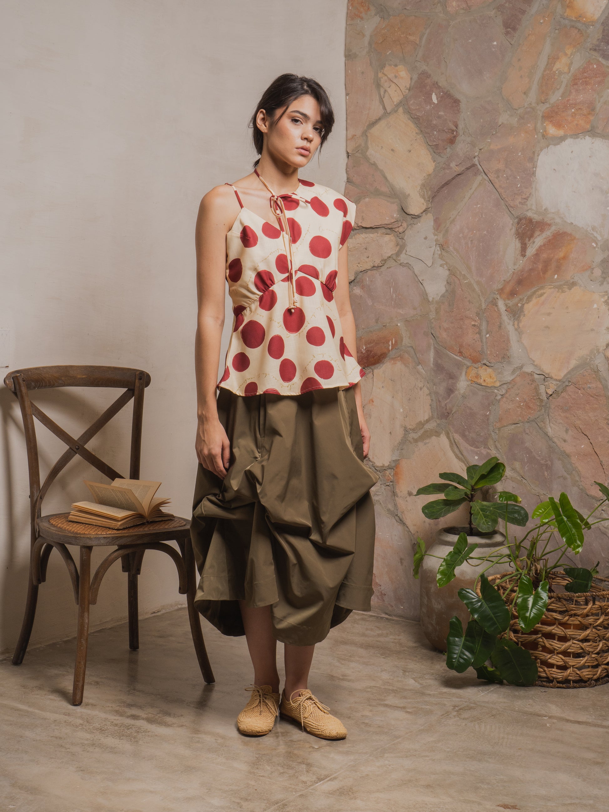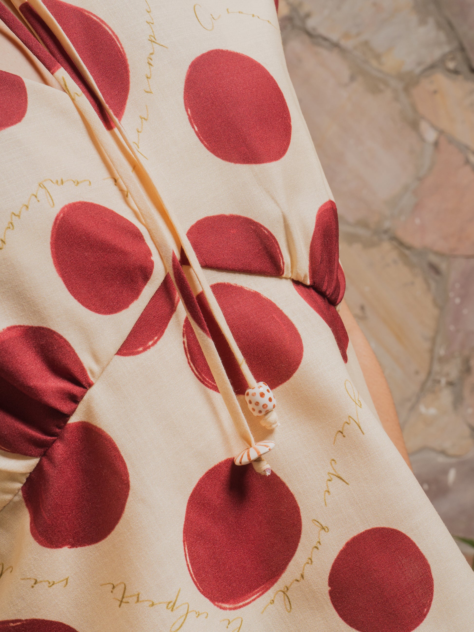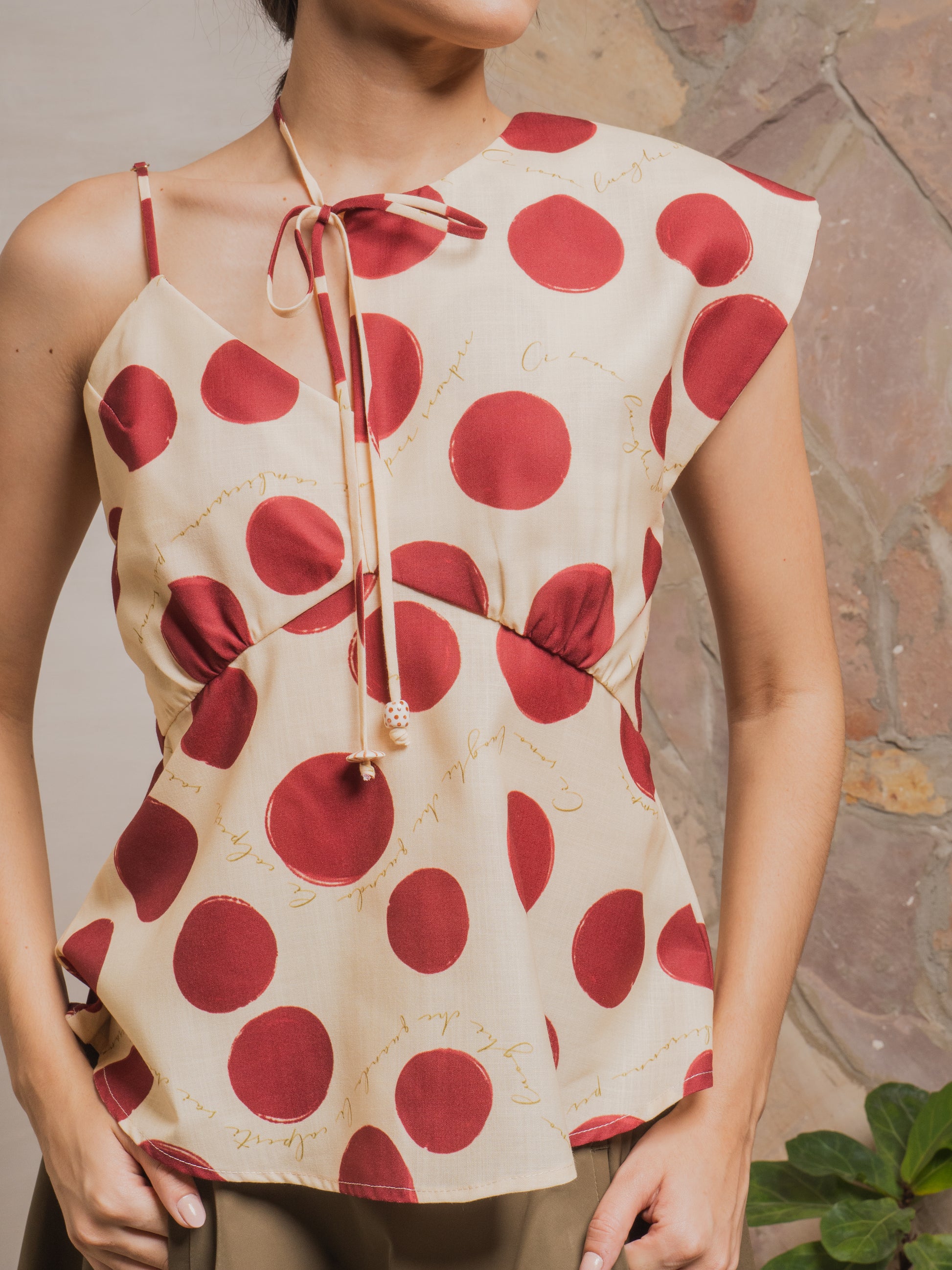 Top de escote irregular , estampado en nuestro print de lunares Sempre . Con detalles en cerámica en las puntas del lazo .